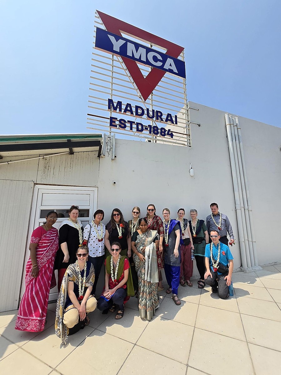 Am 15. Februar landete unsere Reisegruppe, in drei Kleingruppen aufgeteilt, am Flughafen Madurai. Shamila, die Generalsekretärin des YMCAs Madurais, begrüßte uns mit Blumen und dann ging es direkt zum YMCA International Guest House, unserem Zuhause für die erste Woche. Von dort aus erkundeten wir die Umgebung, besuchten den berühmten Meenakshi Temple und lernten einige der Projekte des YMCAs in Madurai kennen. An einem Tag durften wir bei einem Arbeitseinsatz tatkräftig mit anpacken. Zum einen wurde eine Mauer für einen Kindergarten mit bunten Motiven bemalt, zum anderen wurde ein Ablaufgraben für Regenwasser geschaffen. Andere Projekte, wie Schulen für Kinder mit Hörbeeinträchtigung oder Kinder mit geistiger Behinderung schauten wir an und konnten nach dem Unterricht noch mit den Kindern spielen. Beim Abendessen tauschten wir uns oft aus, was wir am Tag erlebt haben, mal als Gruppe unter uns, mal mit Shamila, anderen Mitarbeitenden des YMCAs oder alten Freunden von unseren ehemaligen Volontärinnen. Wir fanden Unterschiede und Gemeinsamkeiten in unseren Leben und unseren CVJMs. Wir lernten Interessantes über die Kultur, Lebensart und die aktuelle politische Lage in Indien. Madurai ist eine Stadt, die noch sehr wenig westlich geprägt ist. Daher ging es natürlich in den ersten Tagen in indische Bekleidungsgeschäfte, bzw. Schneidereien, um uns ortstypische Gewänder zu besorgen. Da Besteck nicht so üblich ist, lernten wir auch das Essen mit den Fingern. Natürlich aßen wir nur der der rechten Hand, da die linke Hand für das Abwaschen auf der Toilette ist. 😉